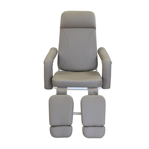 Poltrona articulada para podologia com braços removíveis e reclínio total horizontal. Pernas articuladas com três alturas e extensão de comprimento